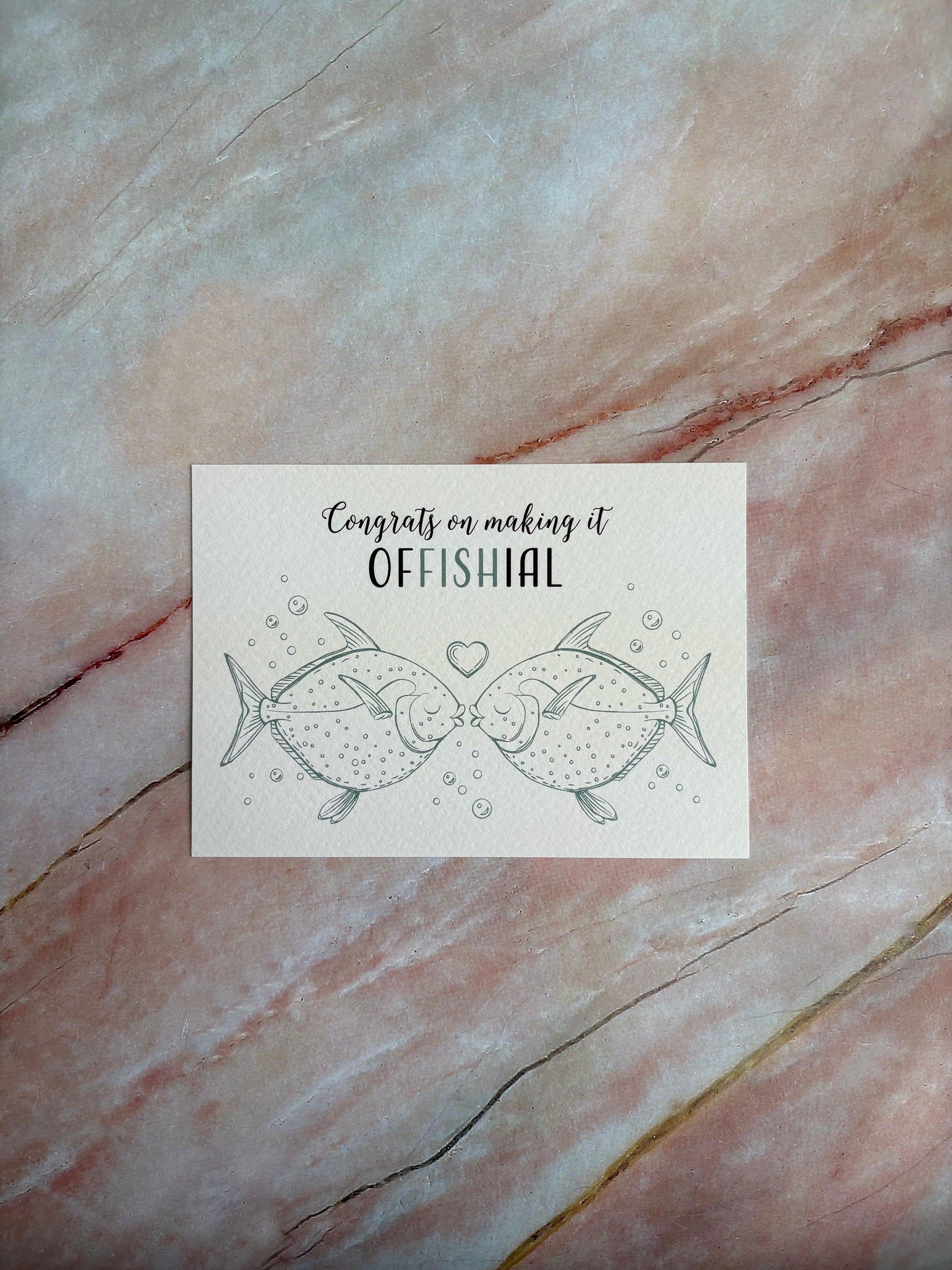 Vier de liefde op een unieke manier met onze ansichtkaart geïnspireerd door de prachtige Zeeuwse kust. Deze charmante kaart toont twee verliefde vissen die zojuist de volgende stap hebben gezet: verloofd, getrouwd of samenwonend. De speelse tekst ‘Congrats on Making it Offishial’ maakt het een perfect cadeau voor elke gelegenheid.