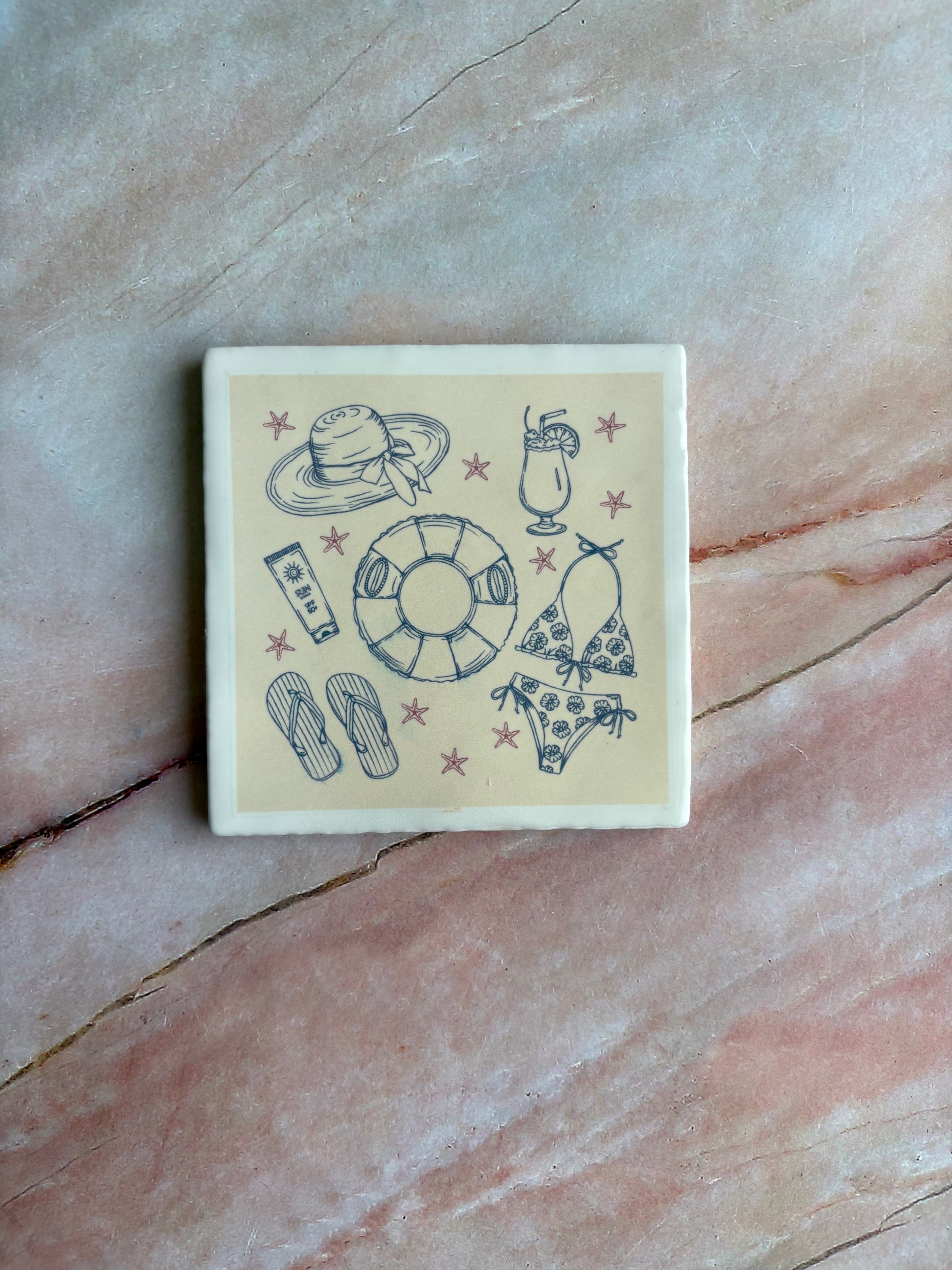 Breng het ultieme strandgevoel in huis met dit Beach Vibes Only decoratieve tegeltje. Het ontwerp toont alle essentials voor een zomerse dag aan zee: een hoed tegen de zon, verfrissende cocktails, een zwemband, bikini, zonnebrandcrème en teenslippers. Samen vormen ze een speelse maar stijlvolle illustratie die direct doet denken aan zonovergoten dagen aan het strand van Zeeland.