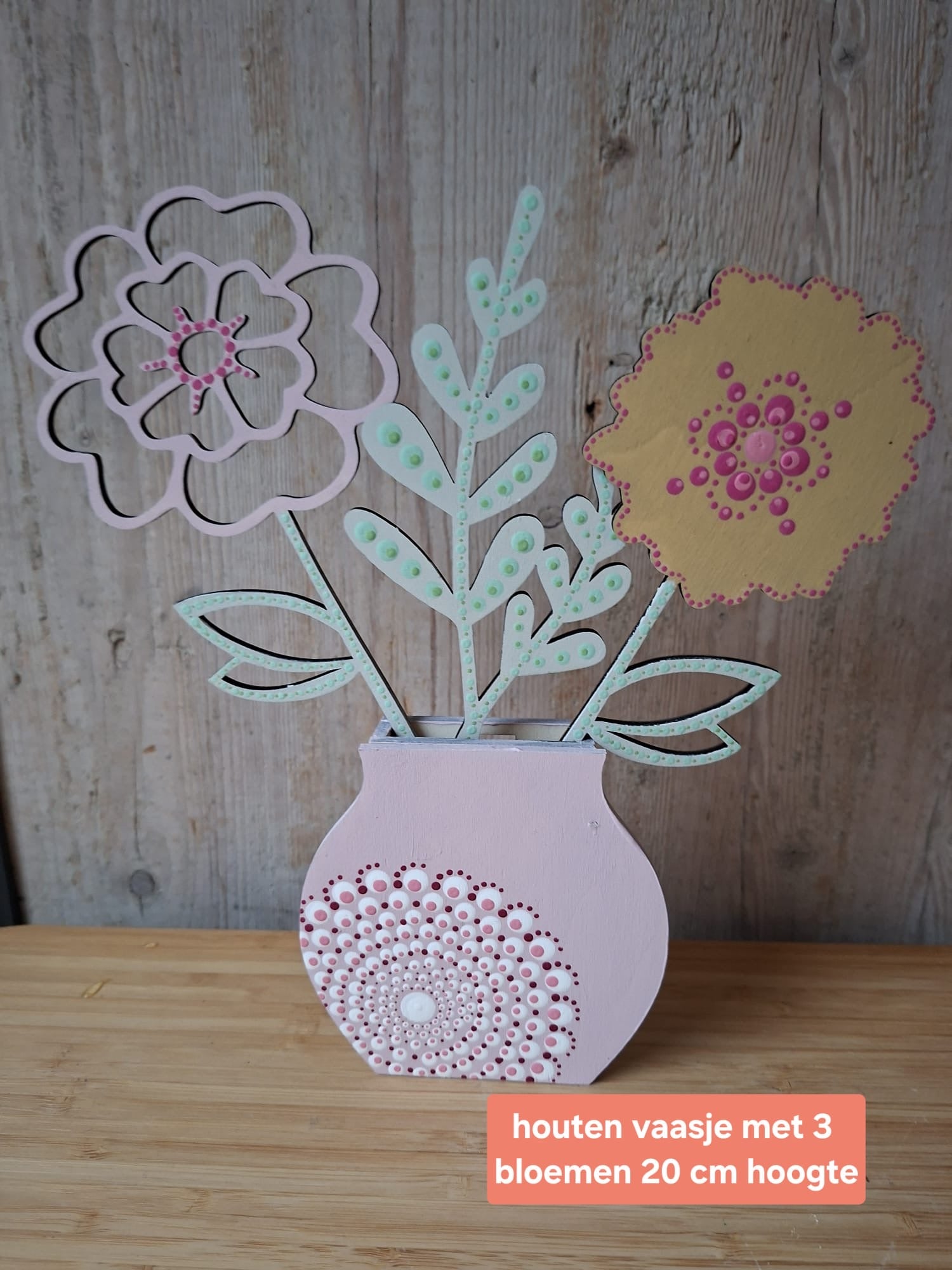 Houten vaasje met 3 bloemen (20 cm hoogte, foto 4) – € 37,50